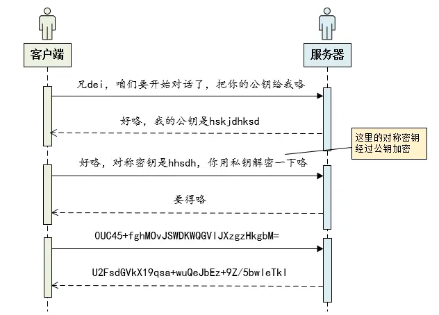 对称加密和非对称加密都存在密钥传输的问题,但是至少非对称加密可以保证客户端传输给服务端的内容无法被“破解”,而对称加密算法性能又比较好,那我们是不是可以这样子呢。第一次通信的时候服务端发送公钥给客户端,由客户端产生一个对称密钥,通过服务端的公钥加密后发送给服务端,后续的交互中都通过对称密钥进行加密传输。也就是说先通过非对称密钥加密对称密钥,通过对称密钥加密实际请求的内容。