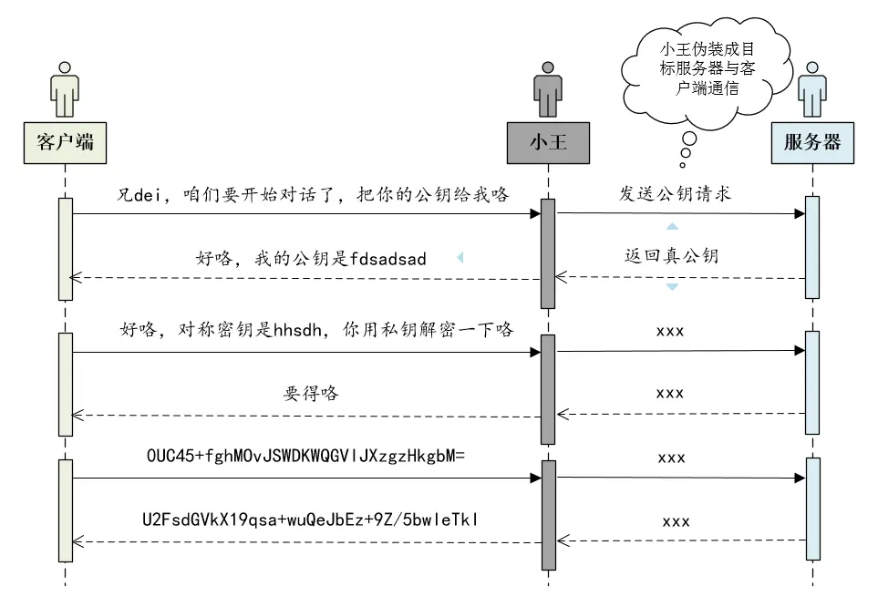 也就是说小王可以伪装成服务器,与客户端进行通信。类似于你与服务端之间多了一个中间商!也就是说协商密钥的过程依然存在漏洞!
