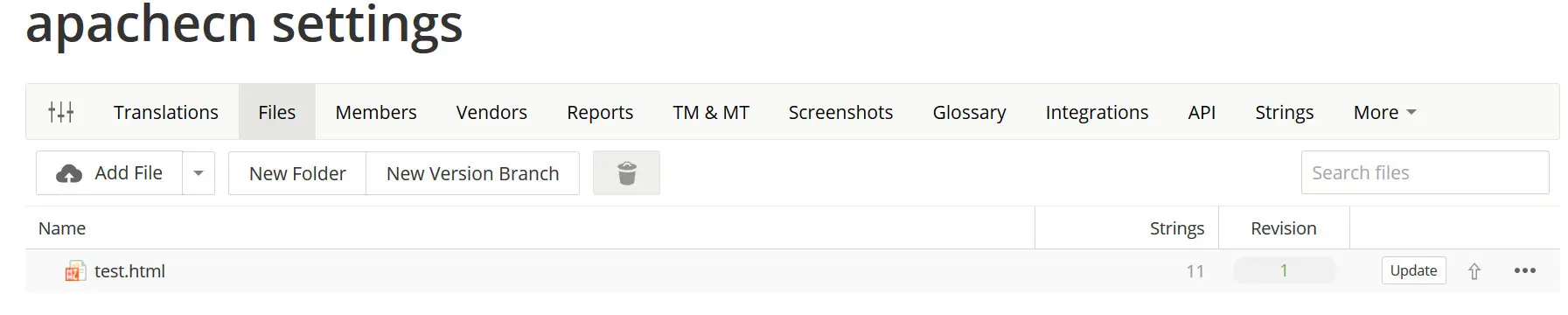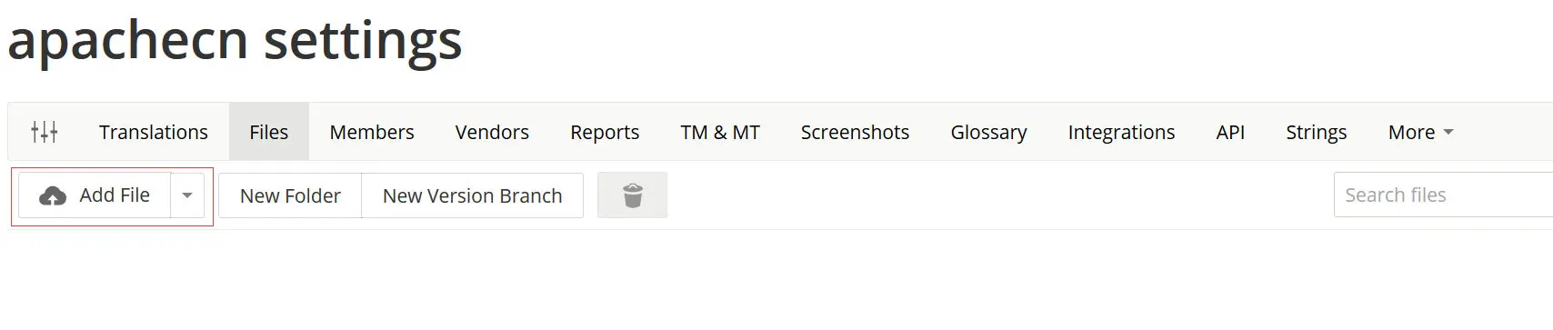 二、点击右上角的Settings,再点击Files,跳到文件页面。也可以直接输入https://crowdin.com/project/<proj>/settings#files。