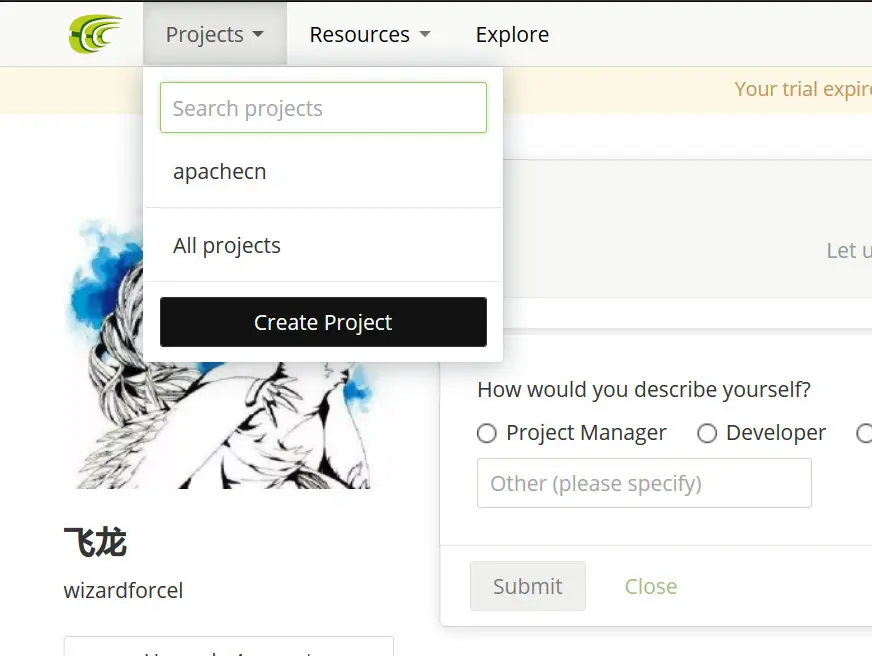 二、之后会跳到个人信息页,点击左上角的Projects -> Create Projects来创建项目。
