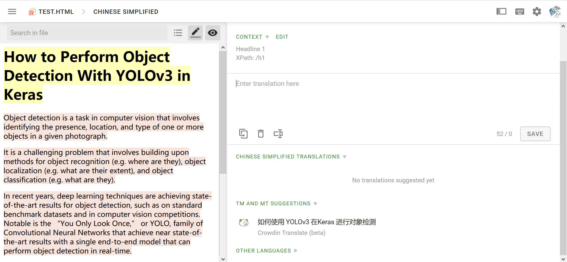 二、等一小会儿之后,进入翻译页面,TM AND MT是机翻结果,可以参考,Enter Trans...处输入翻译,点SAVE保存。