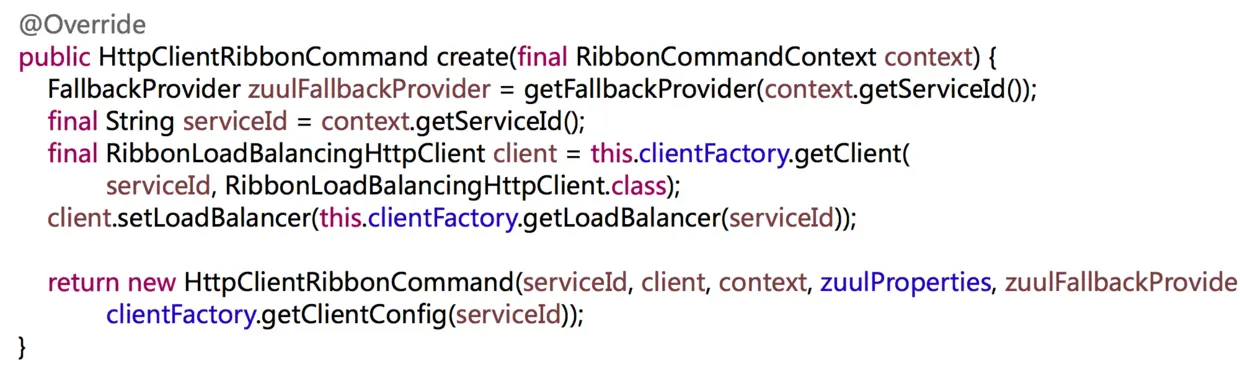 通过create可以定位到具体的实现,这边就看你用的什么Http客户端,默认有三种实现,默认定位到org.springframework.cloud.netflix.zuul.filters.route.apache.HttpClientRibbonCommandFactory.create(RibbonCommandContext)方法。