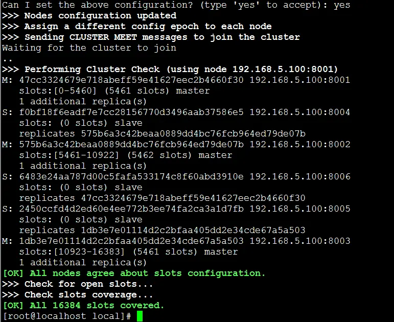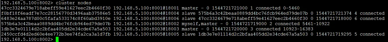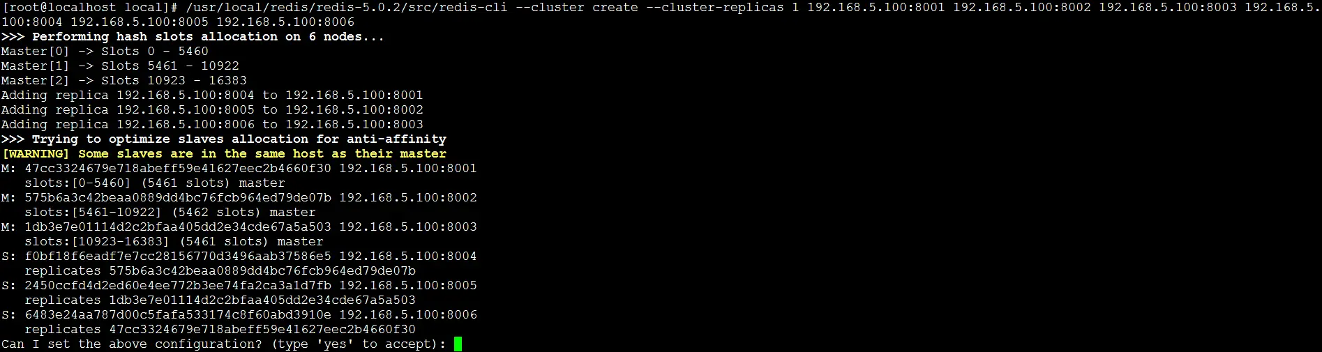 /usr/local/redis/redis-5.0.2/src/redis-cli -a xxx --cluster create --cluster-replicas 1 192.168.5.100:8001 192.168.5.100:8002 192.168.5.100:8003 192.168.5.100:8004 192.168.5.100:8005 192.168.5.100:8006