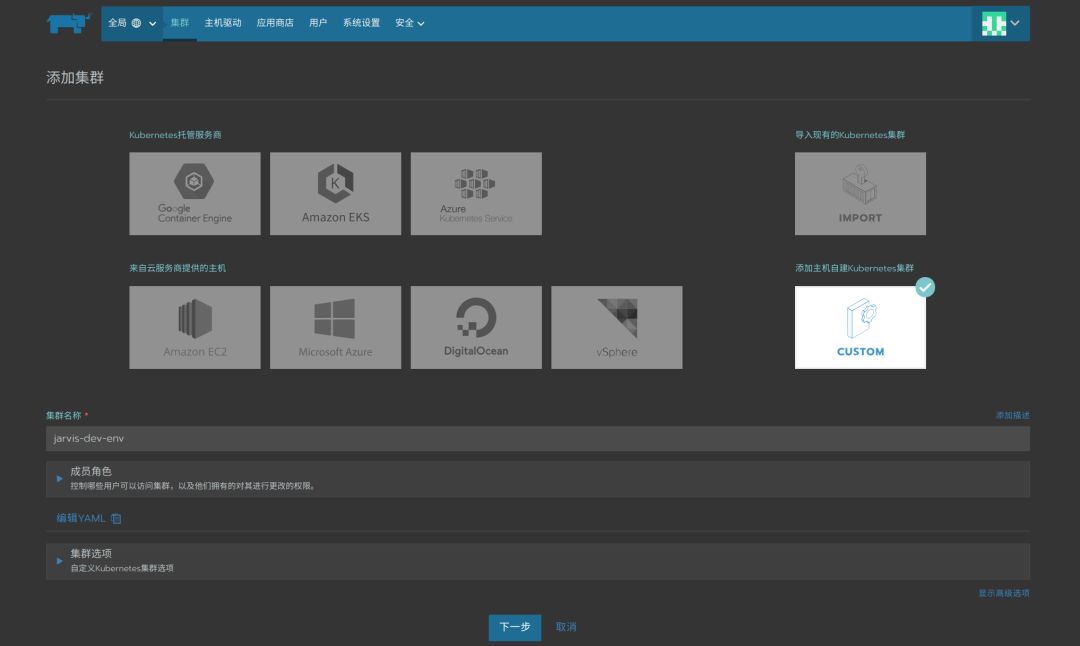 要创建新集群,为集群命名,然后单击“下一步”。在“主机选项”下,选择所有(etcd,Control和Worker)