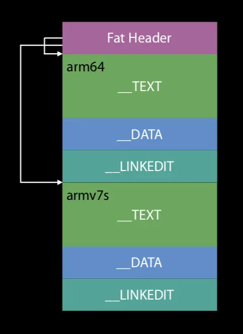 为32位和64位设备编译会分别获得一个Mach-O文件。将两个文件合并后会获得一个Mach-O通用文件,可以同时运行在32位和64位的设备上。