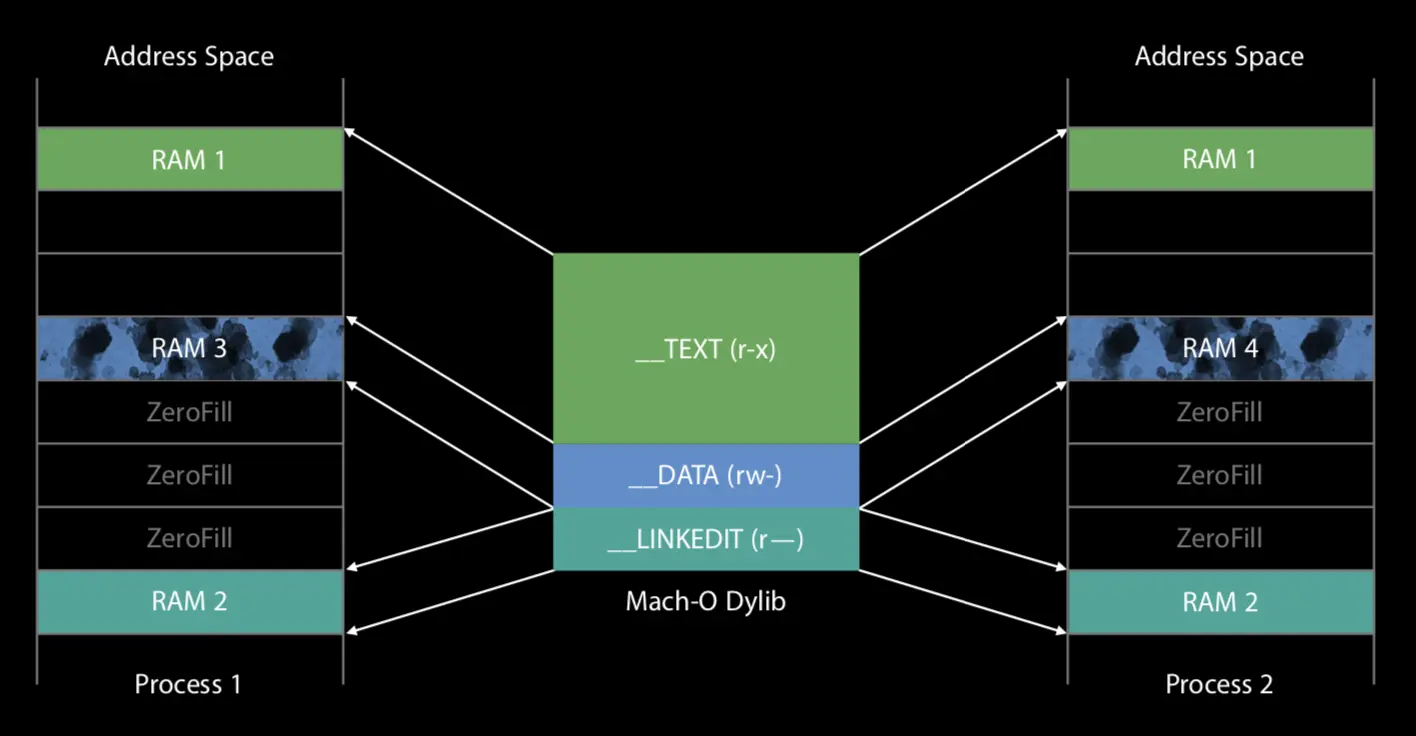 - dyld需要加载Mach-O的header,即图中RAM1。内核会告诉dyld,内存中已经有这个页了。直接映射到进程2的虚拟内存中,无需IO。