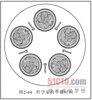 1965年,Dijkstra(迪杰斯特拉)提出并解决了一个他称之为哲学家就餐的同步问题。从那时起,每个发明新的同步原语的人都希望通过解决哲学家就餐问题来展示其同步原语的精妙之处。这个问题可以简单地描述如下:五个哲学家围坐在一张圆桌周围,每个哲学家面前都有一盘通心粉。由于通心粉很滑,所以需要两把叉子才能夹住。相邻两个盘子之间放有一把叉子,餐桌如图2-44所示。