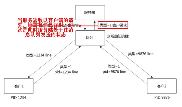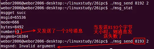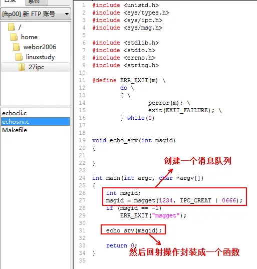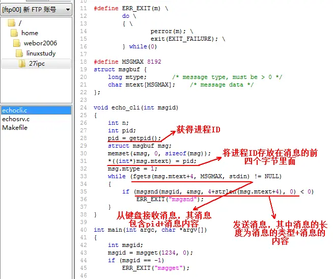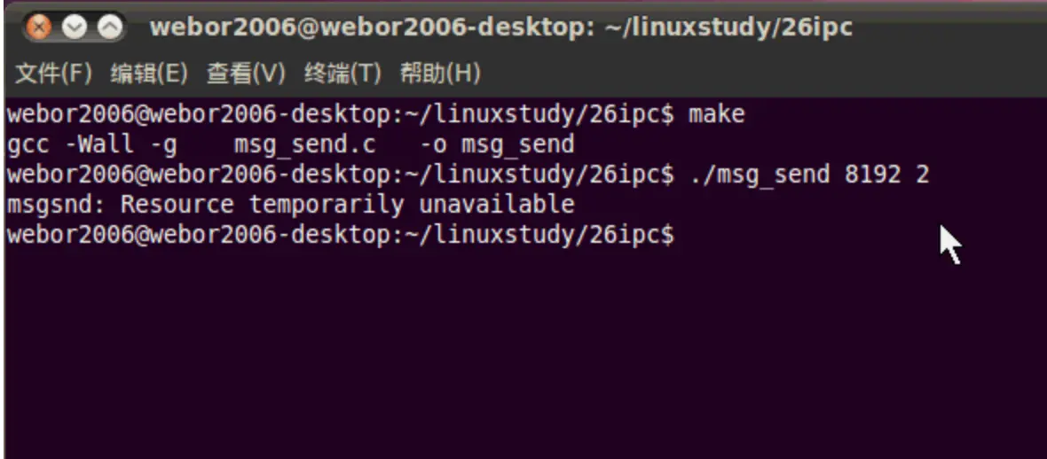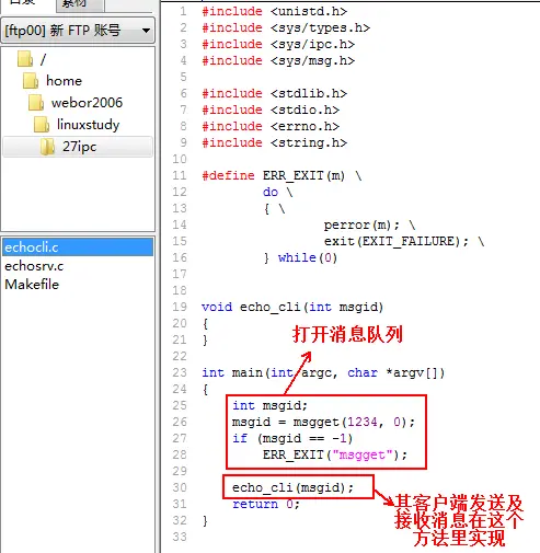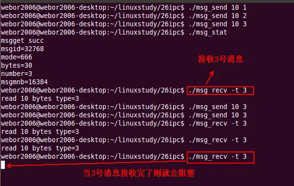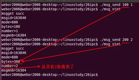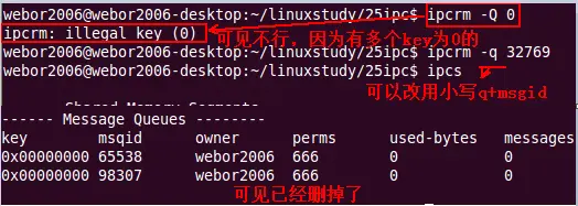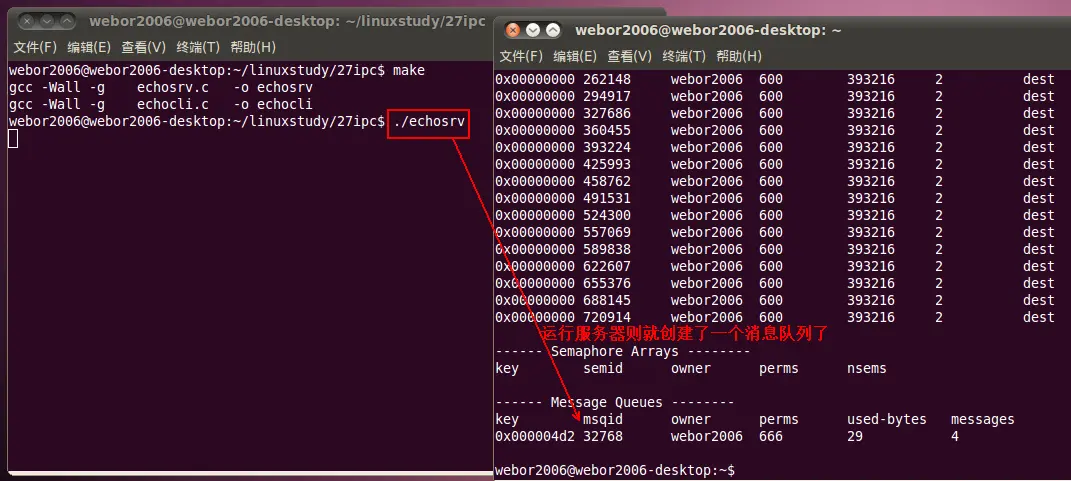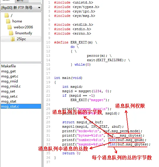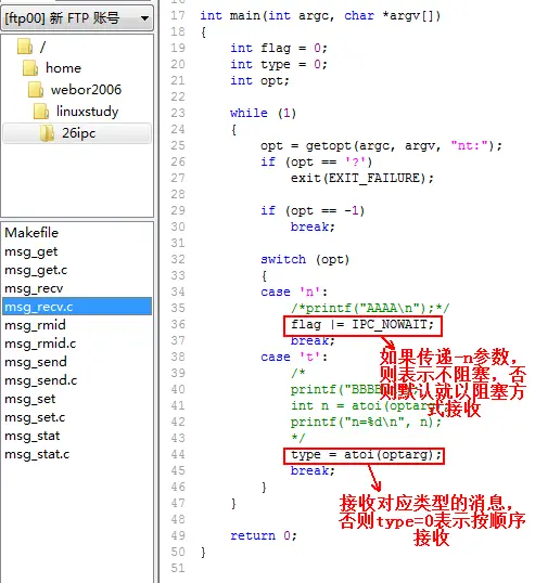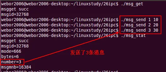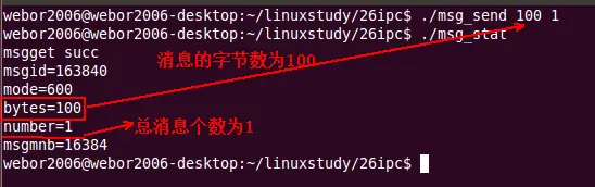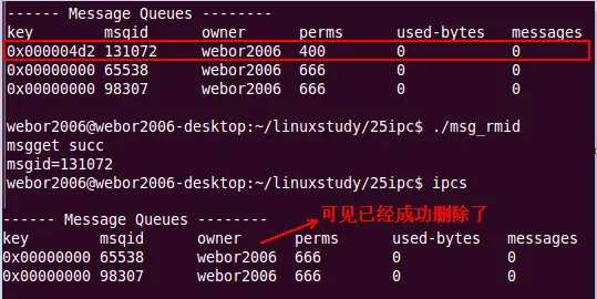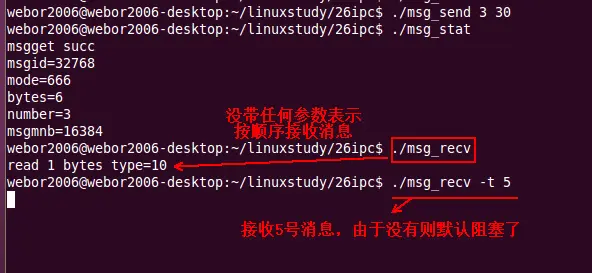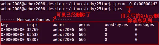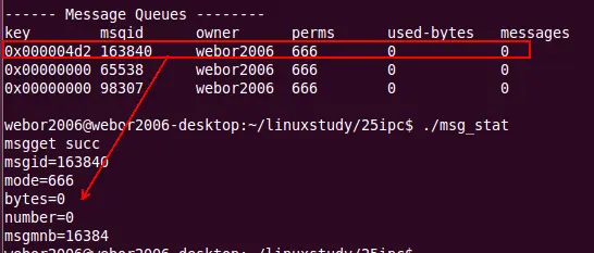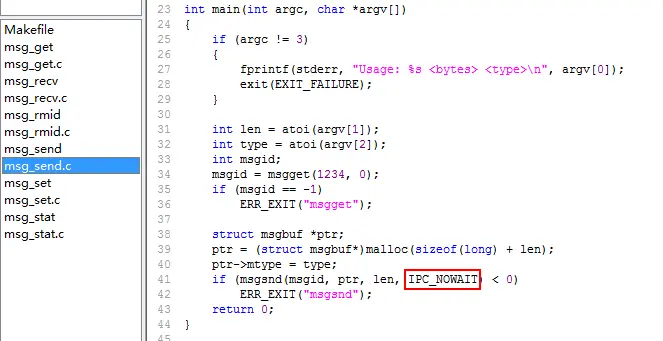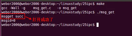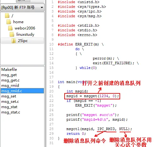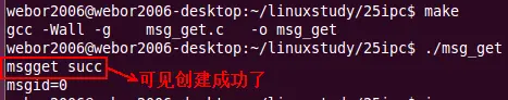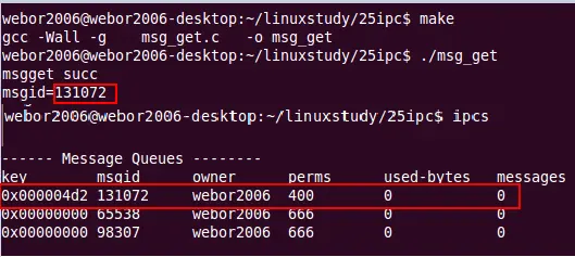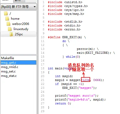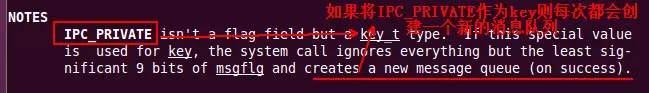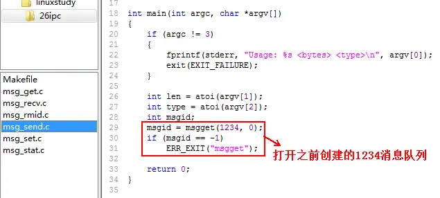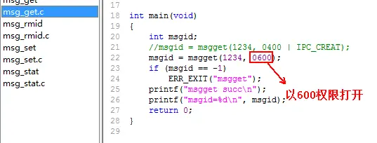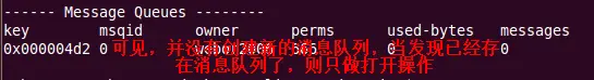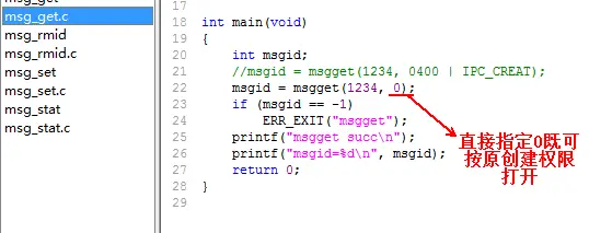 另外一旦一个消息队列创建成功之后,如果要打开一个消息队列,这时候就不用指定IPC_CREATE了,而且参数值可以直接填0: