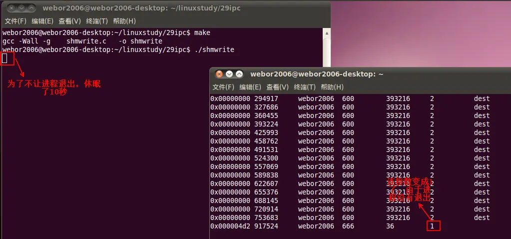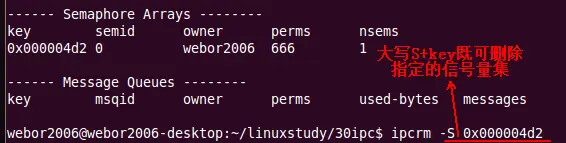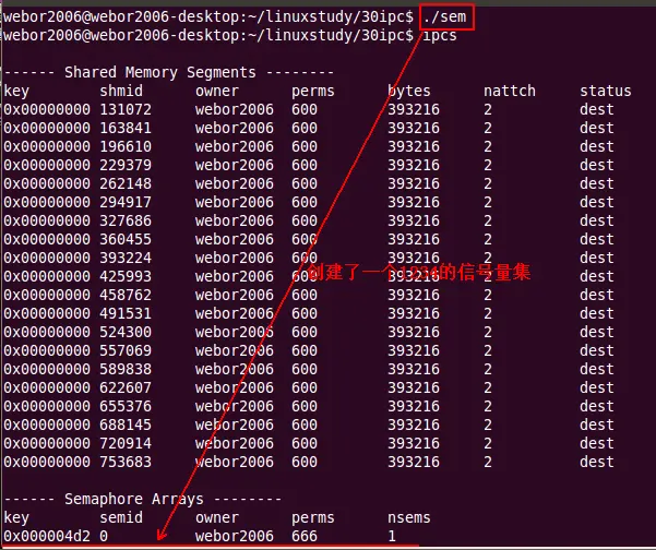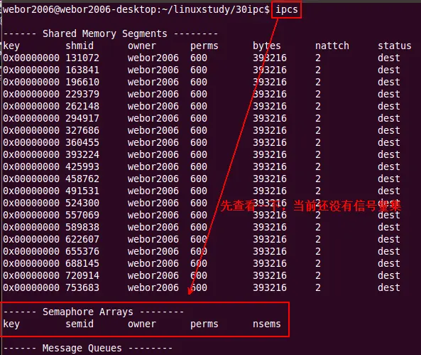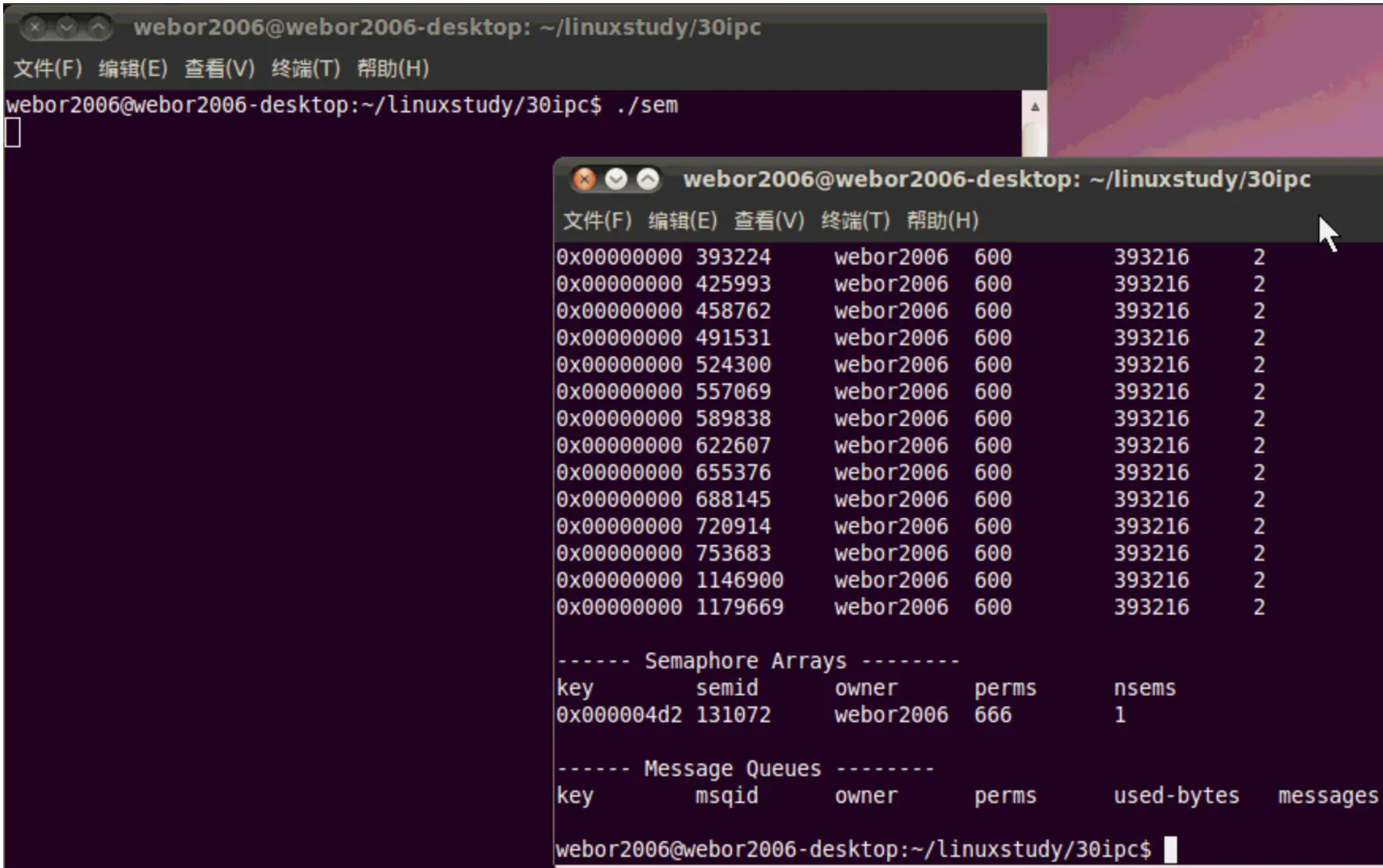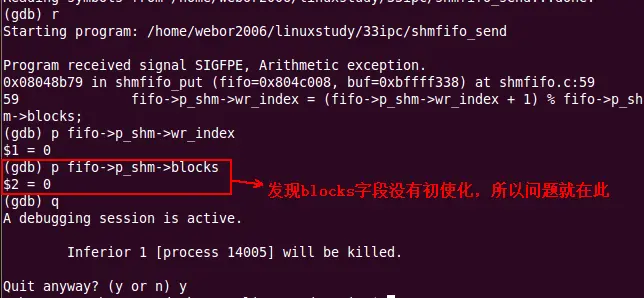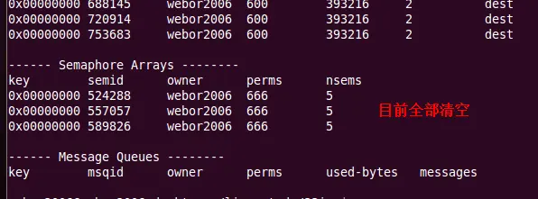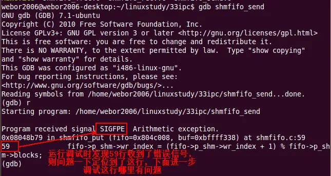 居然生产第一个产品的时候就已经报错了,从这个错误当中很难定位到问题在哪,而这个例外肯定是产生了一个信号,所以下面用gdb来调试一下程序,再正式调查试之前,需要将之前创建的共享内存及信号量集给清掉,否则再次运行就不会报这个错,而是阻塞了: