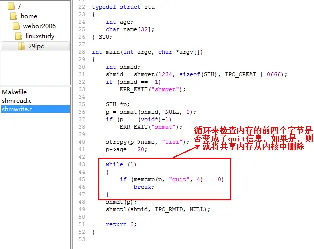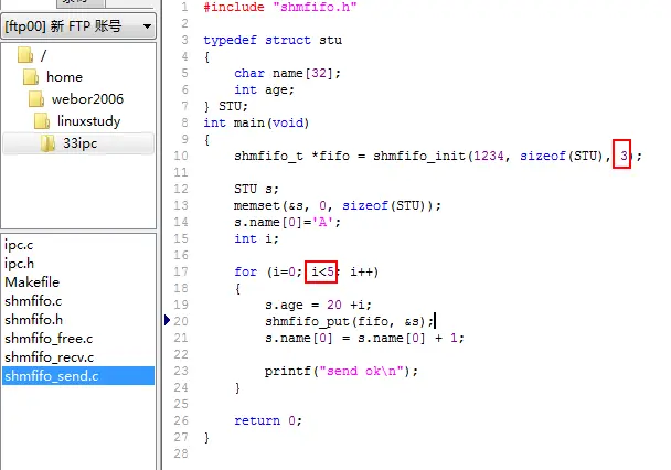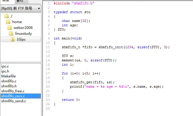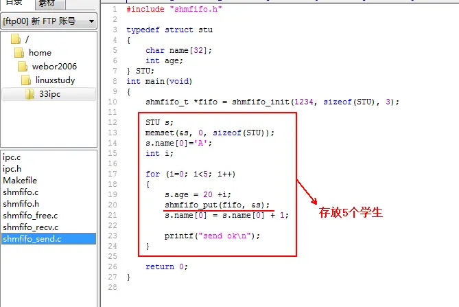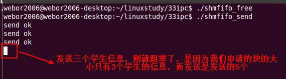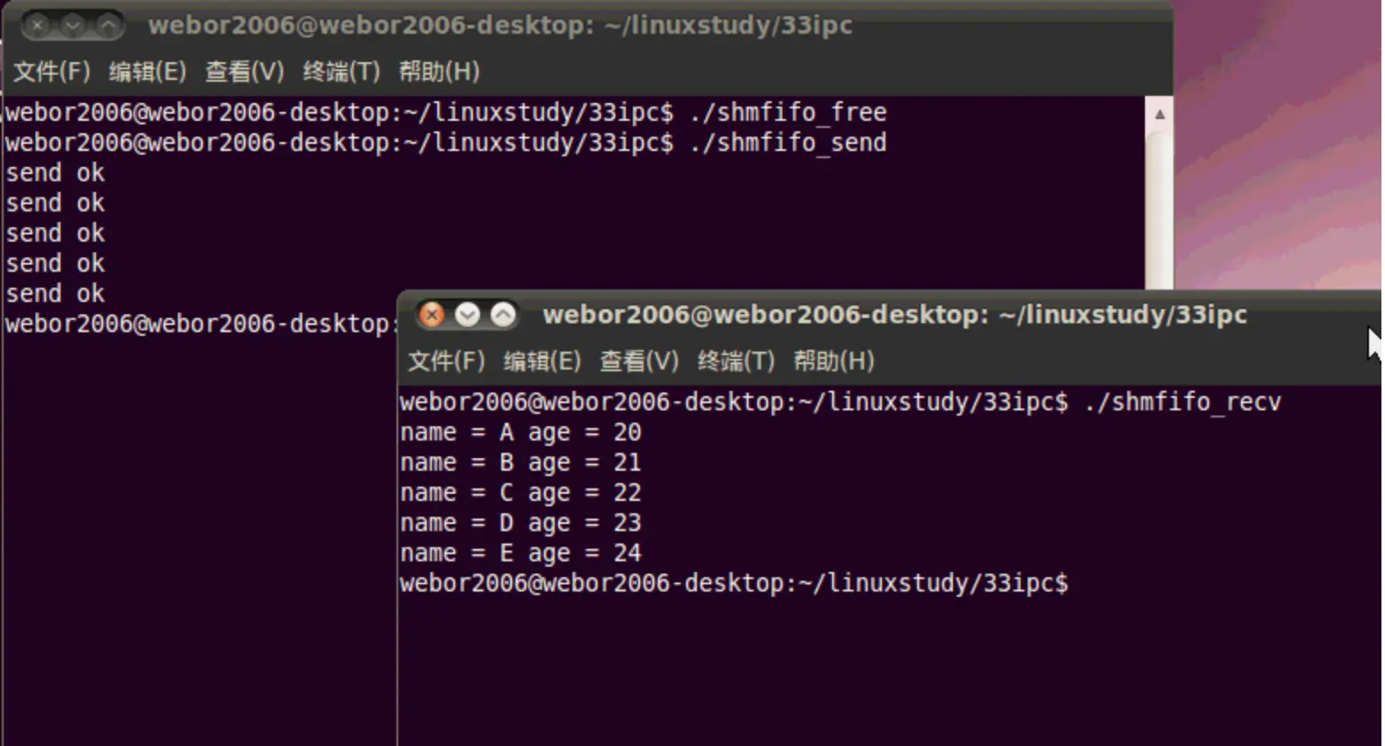从实验结果来看,当接收了数据之后,原来还在等待的2个学生信息就被成功发送了,这就是生产者与消费者的一个效果,实际中生产者可以有多个,消费者也可以有多个,这次学的内容有些多,通过这个例子可以学习怎么利用共享内存和信号量来实现一个先进先出的环形缓冲区shmfifo.