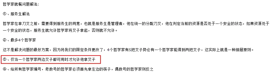 哲学家在拿刀叉之前,需要得到服务生的同意,也就是服务生是管理者,他在统一的分配刀叉,他在判定当前的资源是否处于一个安全的状态,如果资源处于一个安全的状态,服务生就允许哲学家将叉子拿起,否则就不允许。