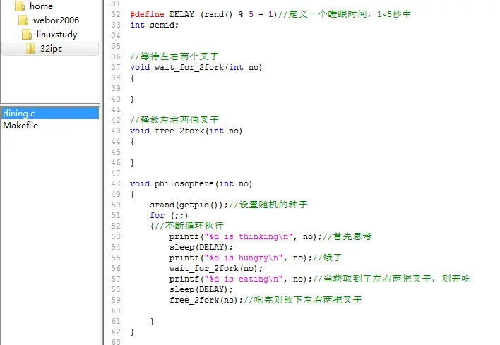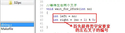 哲学家的生活中有两种交替活动时段:即吃饭和思考(这只是一种抽象,即对哲学家而言其他活动都无关紧要)。当一个哲学家觉得饿了时,他就试图分两次去取其左边和右边的叉子,每次拿一把,但不分次序。如果成功地得到了两把叉子,就开始吃饭,吃完后放下叉子继续思考。关键问题是:能为每一个哲学家写一段描述其行为的程序,且决不会死锁吗?(要求拿两把叉子是人为规定的,我们也可以将意大利面条换成中国菜,用米饭代替通心粉,用筷子代替叉子。)