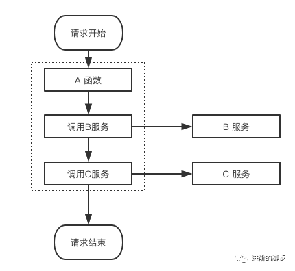 一次请求,依次调用了A函数、B函数、C函数三个函数,那么我们为了避免业务臃肿,对业务做了拆分,把B函数、C函数单独作为一个服务。如下图: