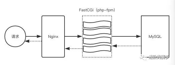 这个是传统的Lnmp架构(暂不考虑php-fpm中是否有RPC),先把一次请求横向做了切分,先给了Nginx,然后转发到php-fpm,最后调用MySQL,然后在回溯到Nginx。我们可以把每一步做成多台机器提供服务,Nginx可以部署多台,php-fpm也可以部署多台,同样MySQL也一样,这样一来每个服务都以集群的形式提供服务了。 如果有疑惑可以看一下《后端进阶:分布式和集群的1分钟教程》。剖开来看,Nginx负责接收http请求头和发送http响应结果,php-fpm负责处理业务逻辑,MySQL负责数据存储。再进一步分析,上述跨进程调用的本质就是进程间的通信, Nginx进程调用php-fpm进程,php-fpm进程调用MySQL服务进程。说到这读者是不是若有所思了呢?别急着回答咱们开篇的问题。再来看另外一个实例。