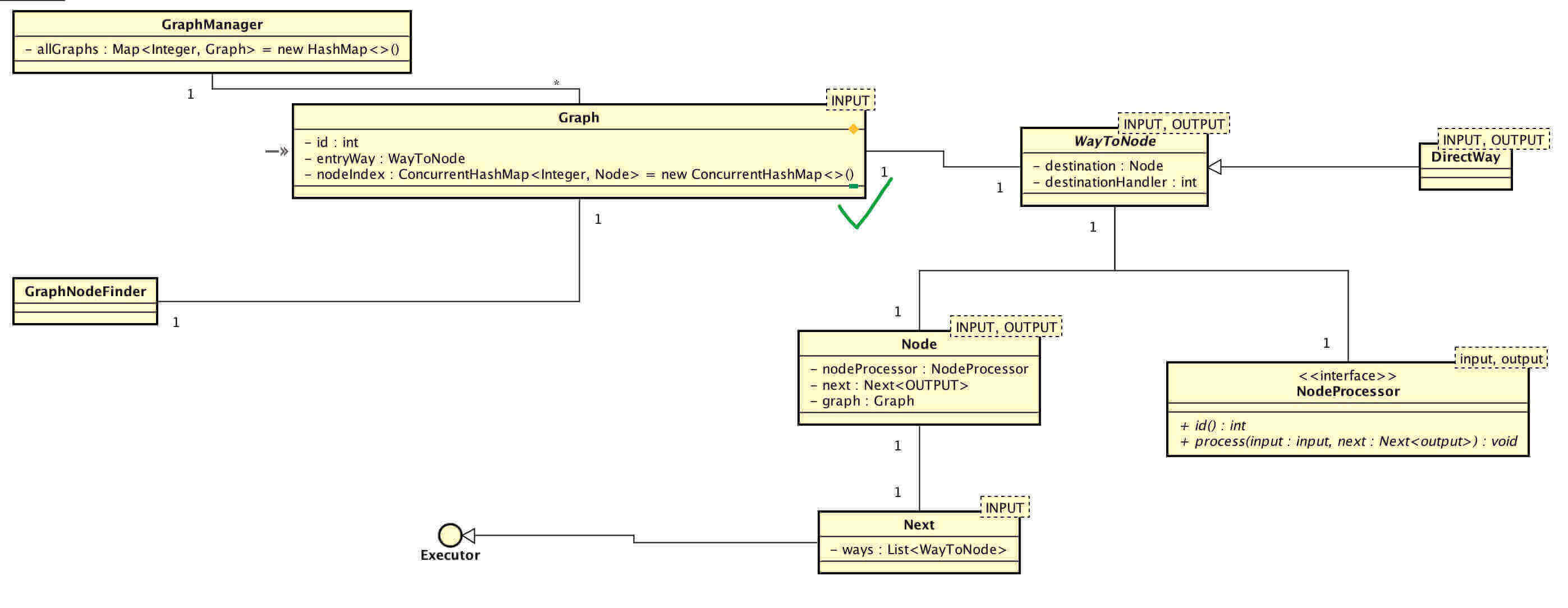 - 粉色箭头:当数据进来时,提交给 Grpah 。按照定义的拓扑图,使用 NodeWay 提交给 Node ,NodeProcessor 进行处理。