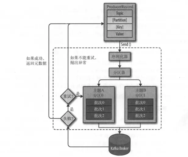 服务器在收到这些消息时会返回一个响应。如果消息成功写入 Kafka,就返回 一 个 RecordMetaData 对象,它包含了主题和分区信息,以及记录在分区里的偏移量。如果写入 失败, 就会返回 一个错误 。生产者在收到错误之后会尝试重新发送消息,几次之后如果还是失败,就返回错误信息。
