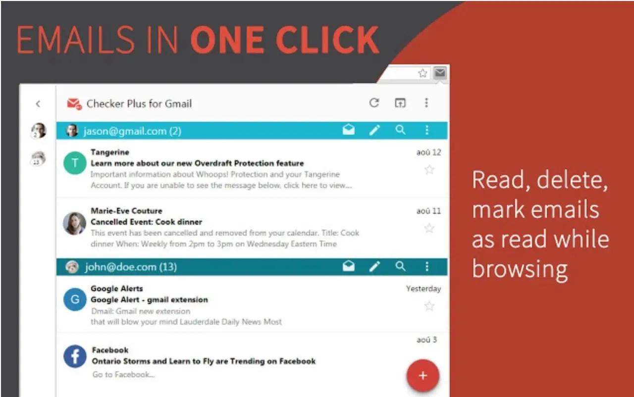 如果你是谷歌邮箱的用户,那么这款名为 Checker Plus for Gmail™ 的插件适合你,它可以多账号管理并提供邮件通知、快捷回复等功能: