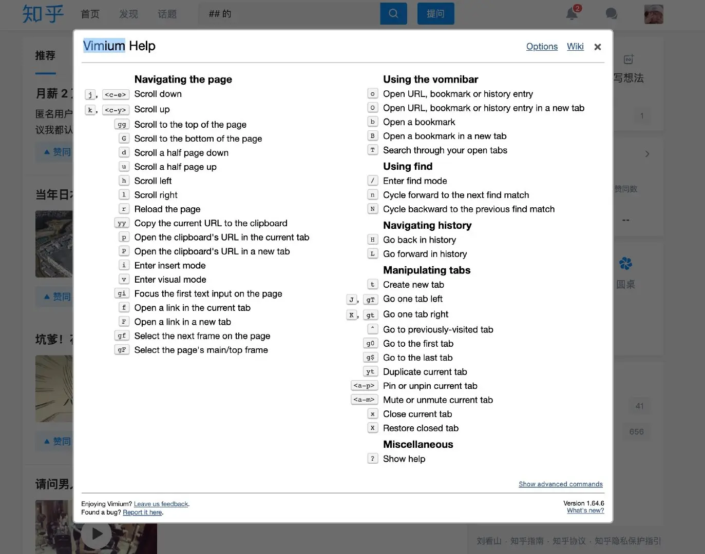 最后再介绍一个我最喜欢的插件 Vimium ,这款插件的厉害之处在于你可以用vim的操作形式赋予Chrome: