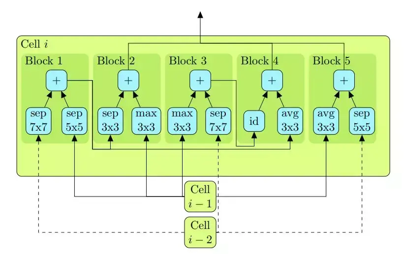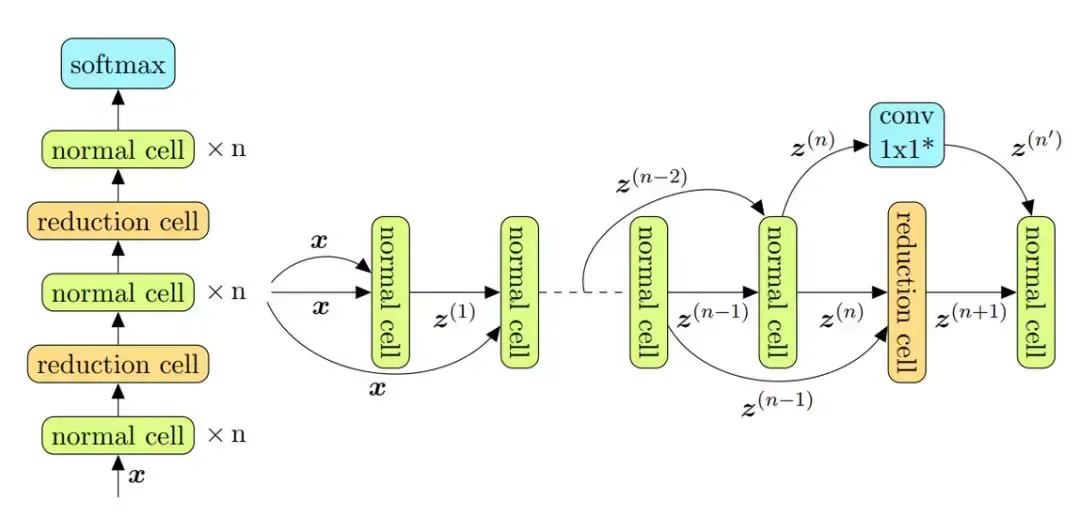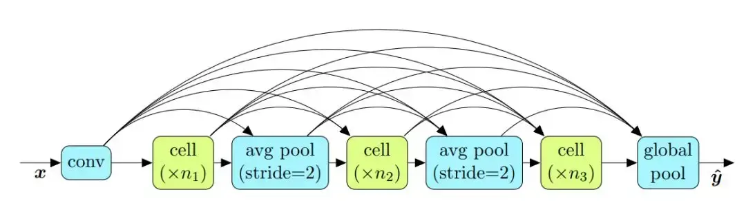 cell-based 搜索空间建立在一个观察结果之上,即许多有效的手工架构都基于重复的固定结构。这样的架构一般是较小的图堆叠起来形成的较大的架构。在文献中,一般将这些重复结构称为单元(cell 或 unit)或块(block)。在本文中用 cell 指代这样的结构。