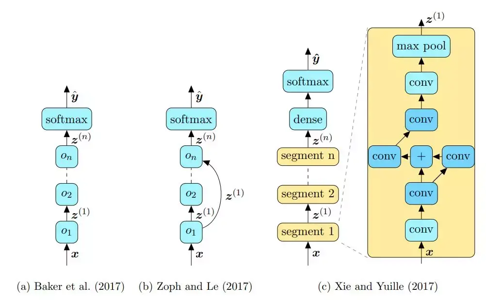 搜索空间的设计构成了神经架构搜索的另一个重要组成部分。除了加快搜索过程外,这还会影响搜索的持续时间和搜索得到的解决方案的质量。在神经架构搜索的早期工作中,设计空间主要是为了搜索顺序架构的。但随着手工构建的分支架构已经在性能上超越了传统网络,因此刚发表不久后就提出了合适的搜索空间,并且这些空间已经成为了该领域的规范(Zoph et al.,2018)。