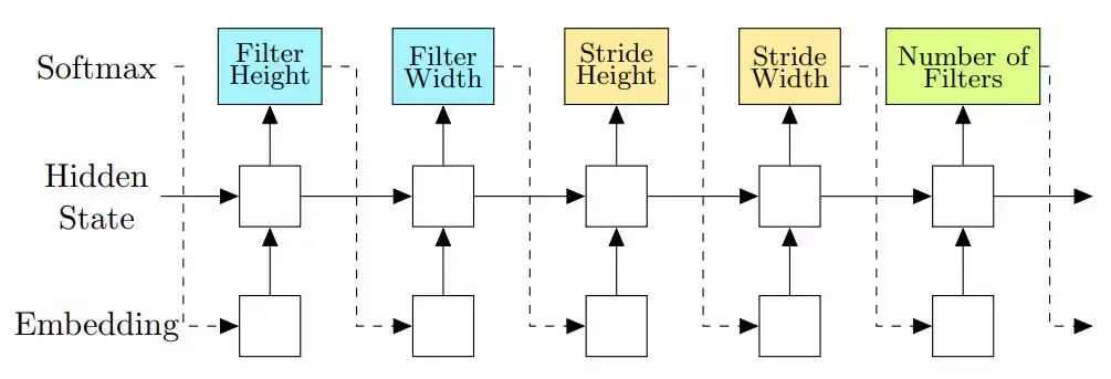 基于策略梯度方法的优化:基于策略梯度方法的替代方法也已经用在神经架构搜索中了。Zoph 和 Le(2017)是第一个研究这种建模方法的。他们直接针对控制器建模,可以将控制器的预测值视为构建神经架构的动作。
