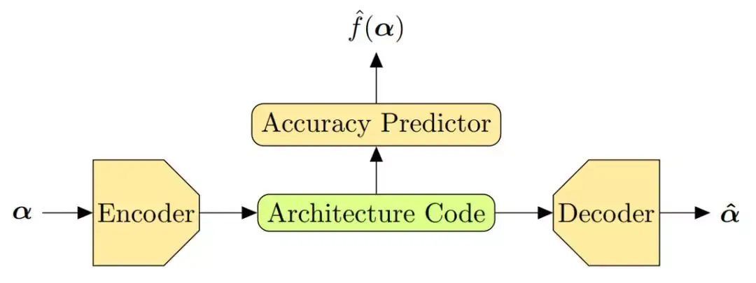 Luo et al.(2018)用了一种有趣的方式。他们共同学习了用于架构表征的自动编码器和代理模型,该代理模型用自动编码器提供的连续编码,即架构代码作为输入(图 15)。