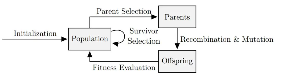 进化算法(Evolutionary algorithms,EA)是基于种群的黑箱函数全局优化器,它必需的组件有:初始化(initialization)、父代选择(parent selection)、重组(recombination)与变异(mutation)以及新代选择(survivor selection)。