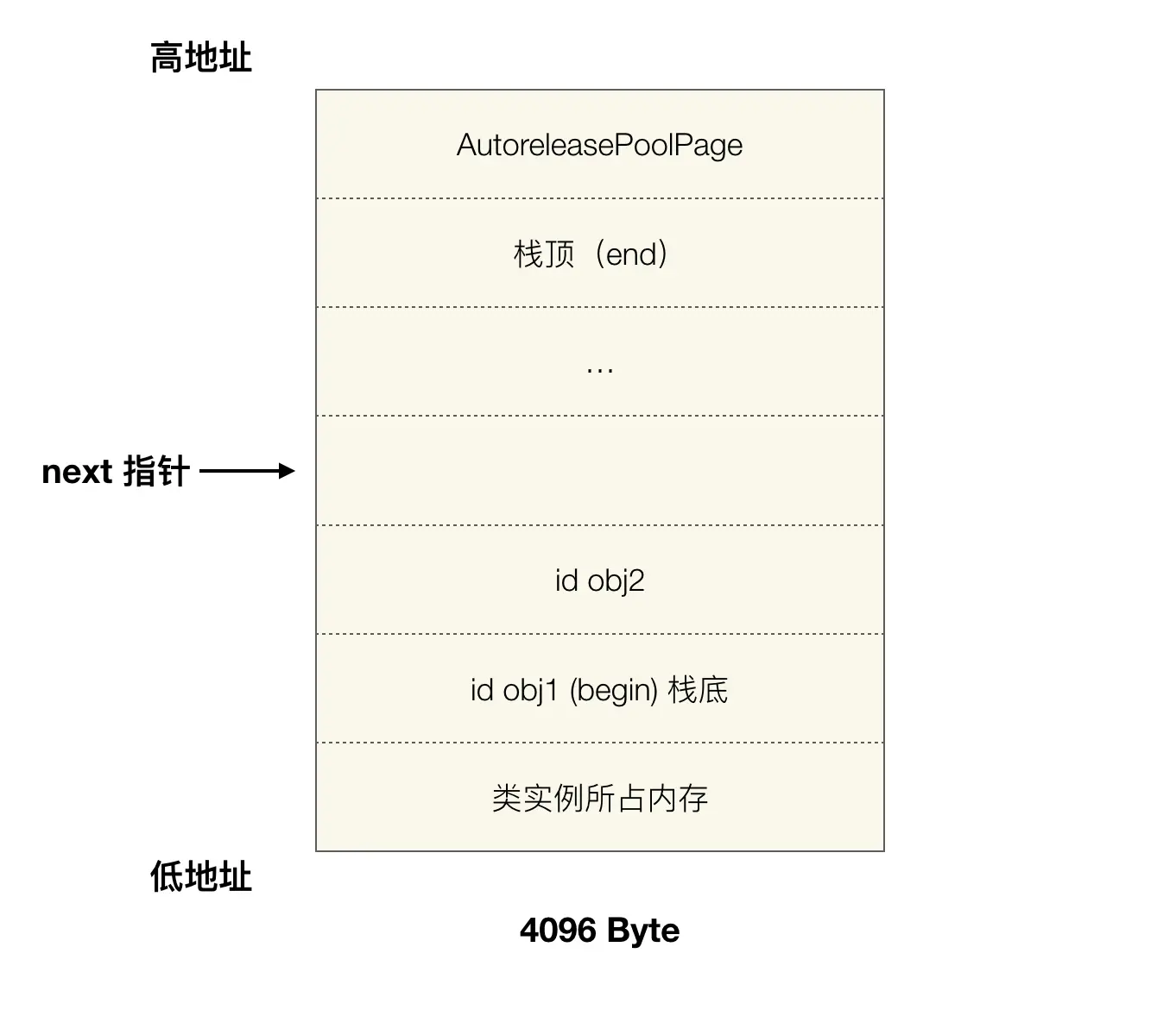 图中的情况,这一页再加入一个 autorelease 对象就要满了(也就是 next 指针马上指向栈顶),这时就要执行上面说的操作,建立下一页 page 对象,与这一页链表连接完成后,新的 page 的 next 指针被初始化在栈底(begin 的位置),然后继续向栈顶添加新对象。
