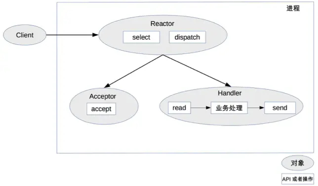 Reactor 对象通过 select 监控连接事件,收到事件后通过 dispatch 进行分发。