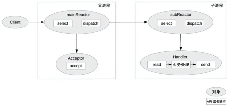 父进程中 mainReactor 对象通过 select 监控连接建立事件,收到事件后通过 Acceptor 接收,将新的连接分配给某个子进程。