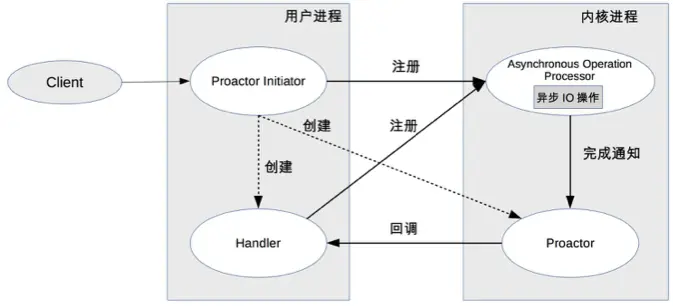 Proactor Initiator 负责创建 Proactor 和 Handler,并将 Proactor 和 Handler 都通过 Asynchronous Operation Processor 注册到内核。