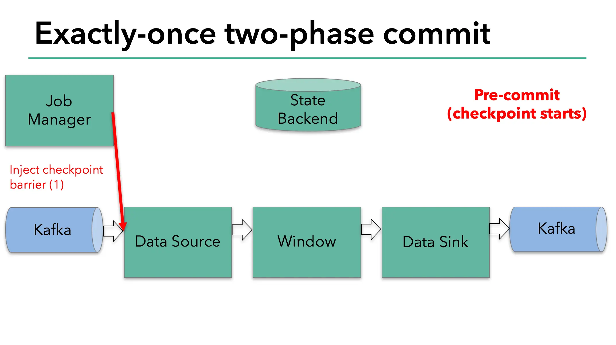 在本文示例中的数据需要写入Kafka,因此数据输出端(Data Sink)有外部状态。在这种情况下,在预提交阶段,除了将其状态写入state backend之外,数据输出端还必须预先提交其外部事务。