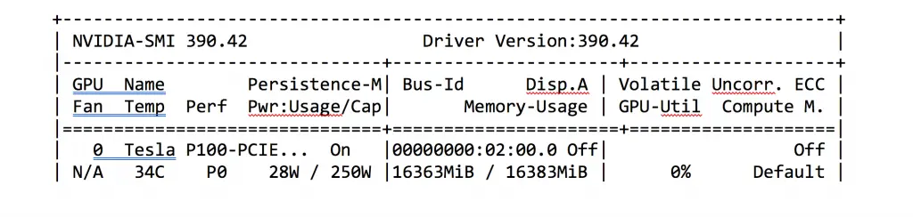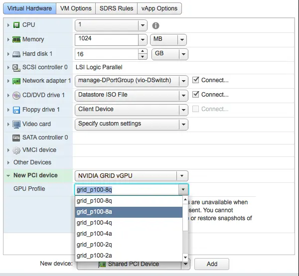 One example vGPU profile we can choose from the above list for the VM is : grid_P100-8q. This profile allows the VM to use at most 8GB of the physical GPU’s memory (which is 16GB in total). Two separate virtual machines on the host server with this profile may therefore share the same physical GPU.