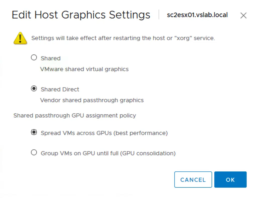 Note: Ensure that you install the VIB AFTER enabling the vGPU mode on your ESXi host. Otherwise, if you try to enable “Shared Direct” in the vSphere Client UI for this device, once the VIB is installed, it will not take effect.