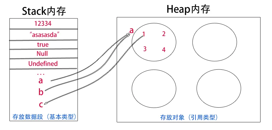 下图中的红色 a、b、c 是定义的引用数据类型变量 指向堆内存中某块空间里面 存有 1 2 3 4