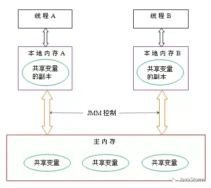 Java线程之间的通信由Java内存模型(JMM)控制,JMM决定一个线程对共享变量的修改何时对另外一个线程可见。JMM定义了线程与主内存的抽象关系:线程之间的变量存储在主内存(Main Memory)中,每个线程都有一个私有的本地内存(Local Memory)保存着共享变量的副本。本地内存是JMM的一个抽象概念,并不真实存在。