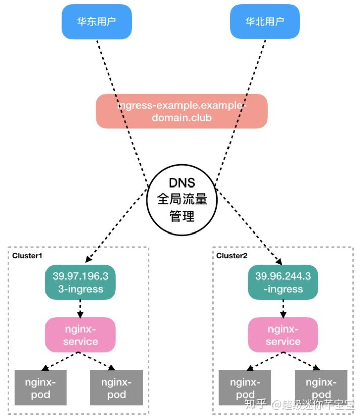 为了为用户提供更好更快的服务,我们希望用户可以就近访问我们的服务,如下图所示,我们希望华东用户访问我们Cluster1的服务,华北用户访问Cluster2的服务。