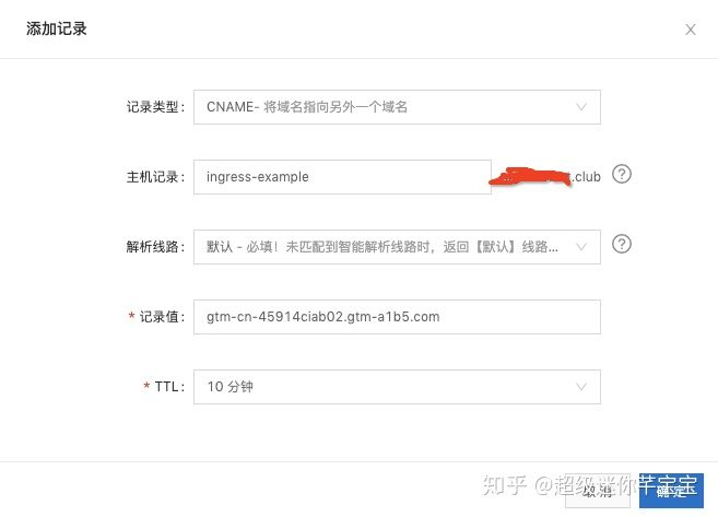 39.96.244.3注意【ingress-example.example-domain.club】为测试域名,请注意替换成自己在阿里云上购买的域名。