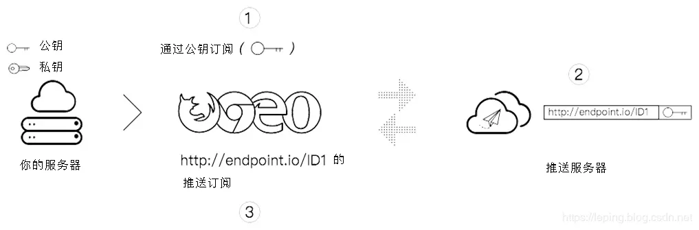 - endpoint:包含订阅相关的推送服务器的信息。以 URL 形式展示。最好对于这个 URL 安全,防止被其他人劫持它并滥用推送功能。