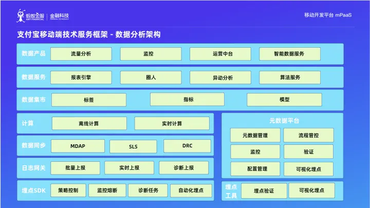 这是整个支付宝移动端无线基础团队的技术架构图,同时蚂蚁金服体系内的其他业务 口碑、网商银行、香港支付宝、天弘基金等) 通过移动开发平台 mPaaS进行代码开发、打包、灰度发布、上线、问题修复、运营、分析。因此,mPaaS 源自于支付宝移动端的核心技术架构,并在 App 全生命周期的每个环节提供特定的能力支持。接下来,我们将着重分享“日志诊断”和“移动分析”两个能力背后的架构演进和选型思考。