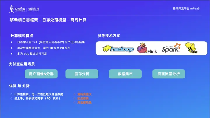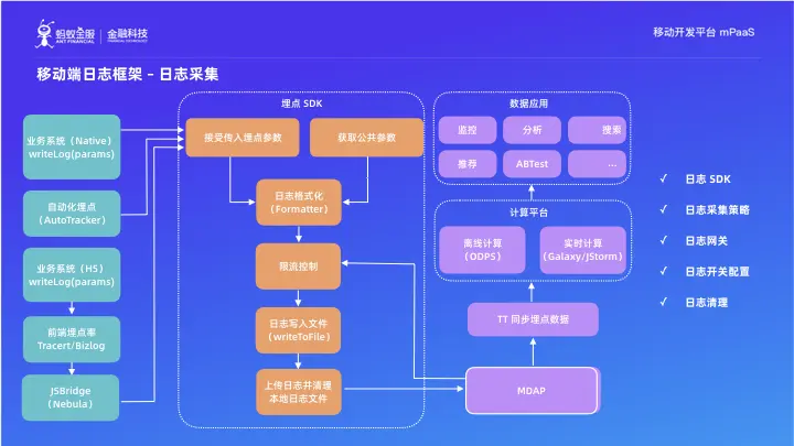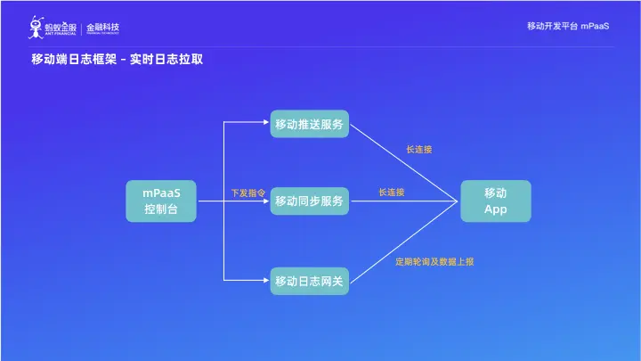 相应的,我们再对焦看一下支付宝埋点相关的应用服务:实时日志拉取。其中,它的主要技术框架包括了 mPaaS 里面的 MPS (消息推送)、MSS(数据同步)、以及日志网关。这是因为蚂蚁系 App 会与 MPS (安卓系统)、MSS (苹果系统) 保持长连接,在需要实时拉取日志的时候,用户可以在 mPaaS 的控制台上面通过这两个渠道下发指令,然后客户端就会把加密的明细日志全部上报到日志网关。