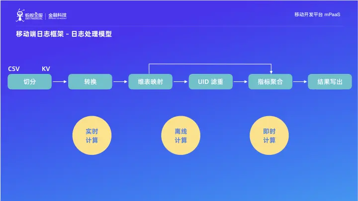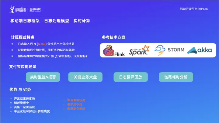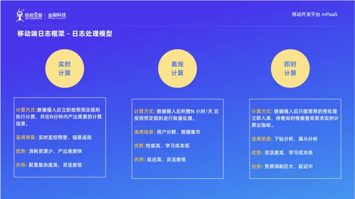 就是指把计算的指标的结果输出到各种存储或者通过接口发送给 mPaaS 的客户。目前我们的计算方式有三大类,实时计算、即时计算和离线计算。下面我会介绍这三种计算方式。