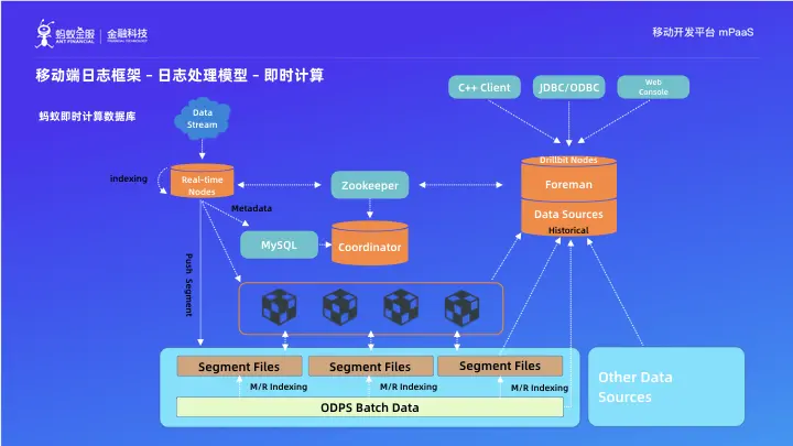 这是目前支付宝内部的一个即时计算框架的技术架构图。从图中可以看出来目前即时计算的技术架构包括用来接收数据写入的实时日志节点(Read-time Nodes)、用于存储历史数据的深度存储(HDFS、AFS、OSS 等多种类型)、用来对历史数据(一天以前的数据)提供查询分析能力的历史节点(historical)。这个计算框架完全的支持 MySQL 协议,用户可以直接用 MySQL 客户端对其进行操作。还有一个重要特性是,他可以对任意的外部数据联合进行分析。