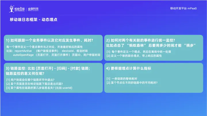 (1)行为埋点:用于监控业务行为,即业务层传递的日志埋点属于行为埋点,行为埋点属于“手动埋点”,需要业务层开发同学自己开发。不过也不是全部的业务行为都需要业务方手动开发,有一些具备非常通用性的业务事件,支付宝把它们的埋点记录放到了框架层,如报活事件、登录事件。因此,行为埋点也可以叫做 "半自动埋点"。