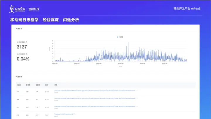 针对于非常重要的性能指标: 闪退、卡顿、卡死, mPaaS 根据多年经验准备了对应的大盘。如图所示,上半部分是每分钟的闪退数,下面是我们根据闪退分类算法梳理出来的各个闪退分类情况,针对每个分类大盘里我们还能看到具体的设备分布情况。