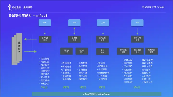 最后,让我们从逻辑结构上再梳理一下 mPaaS 的服务端结构。mPaaS 包含五个核心组件: