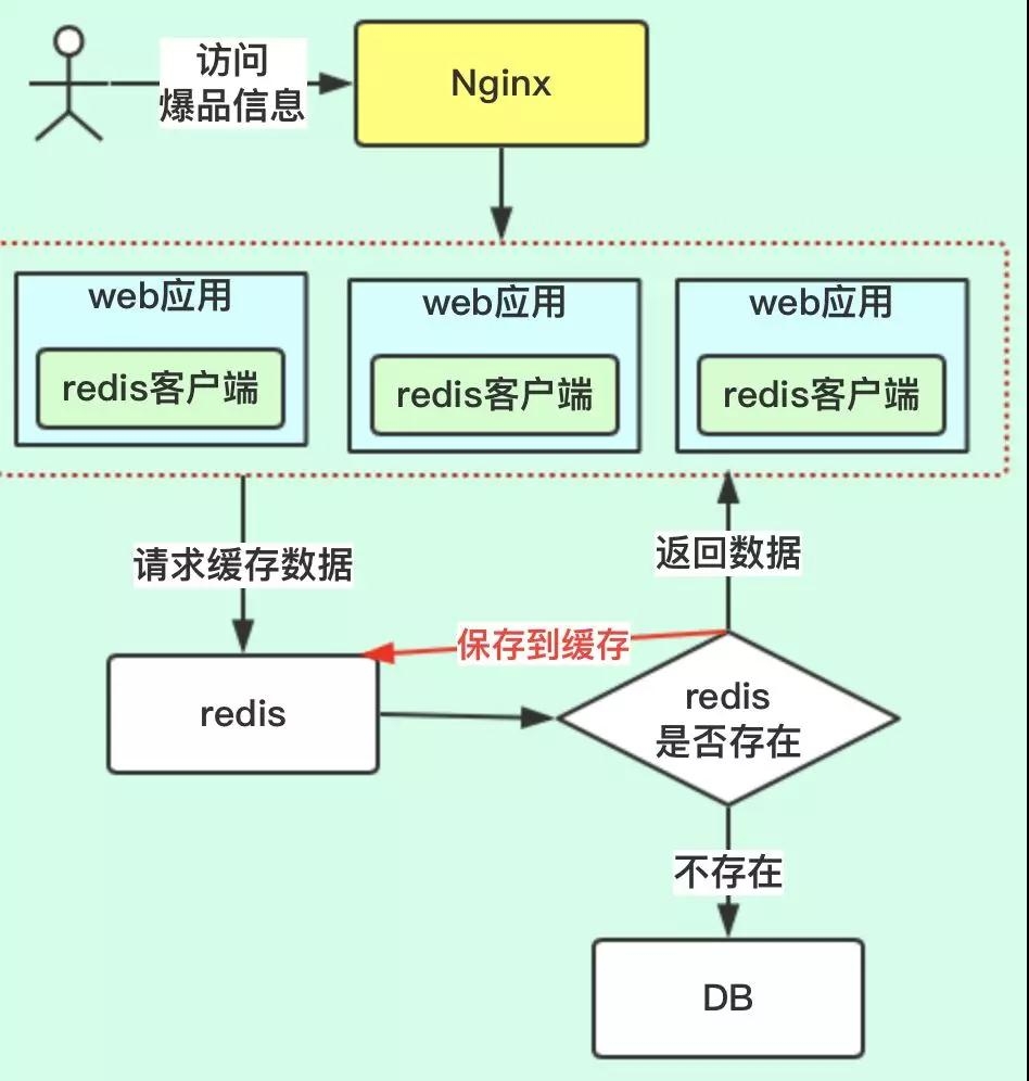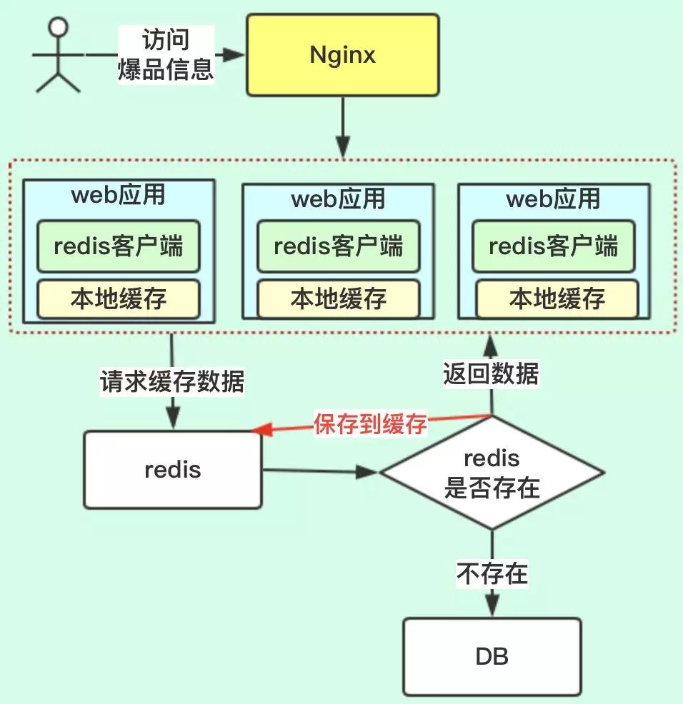 改造web应用服务,在获取到redis缓存后,在web服务本地把热点的数据进行缓存,因为热点的商品不会很多,所以保存在本地缓存中,是没有问题的。这样请求数据时,如果web本地有缓存数据,就直接返回了。