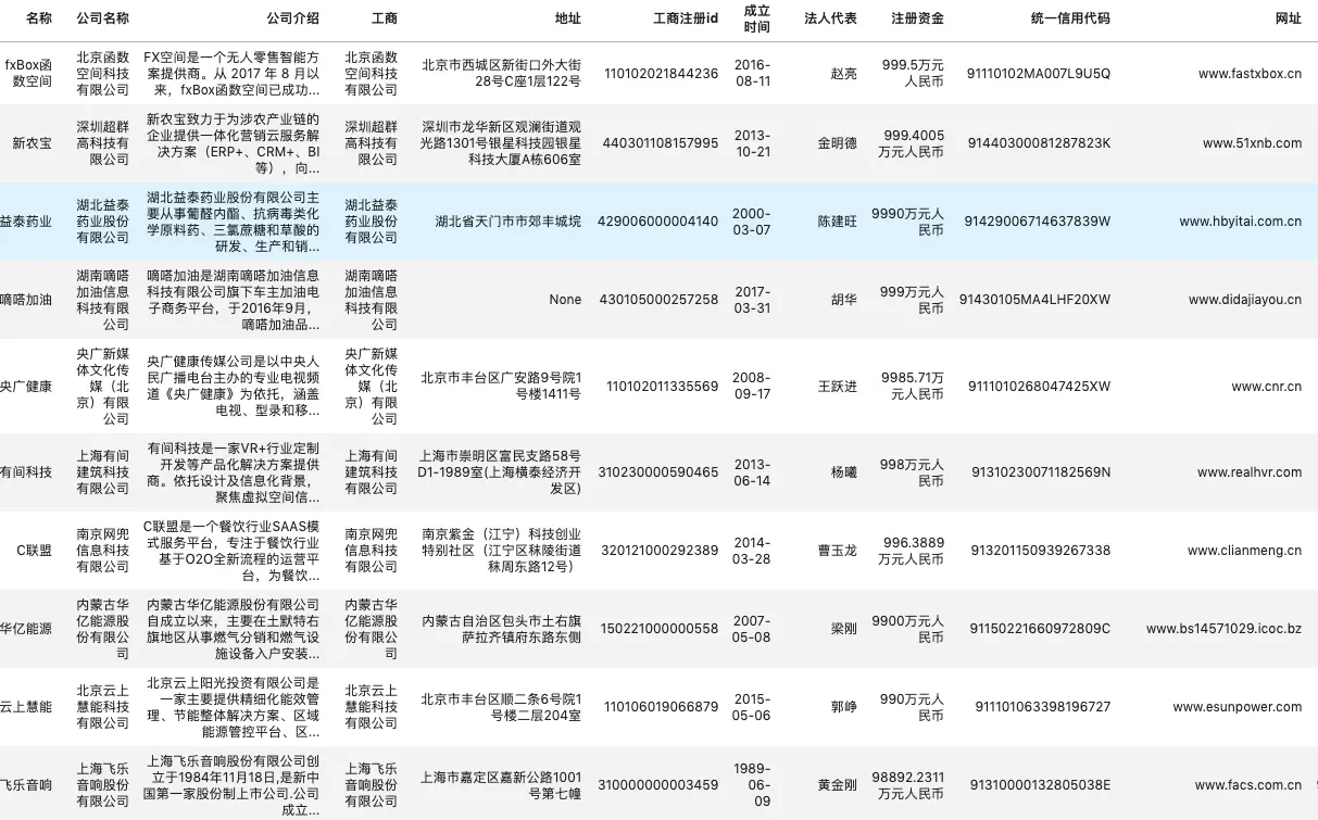 | 企业工商信息 | 名称,公司名称,公司介绍,工商,地址,工商注册id,成立时间,法人代表,注册资金,统一信用代码,网址 |