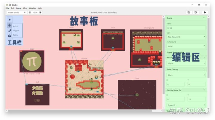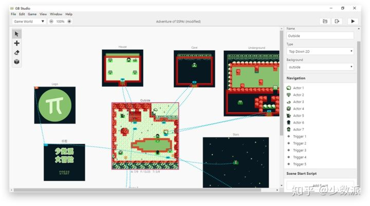 GB Studio 的界面非常直观,新建一个项目后,摆在你眼前的就是整个游戏的故事板。你可以在故事板上看到包括 Logo、开始界面在内的所有场景。点击场景或内容物即可在右侧修改其属性,或是为其添加脚本。