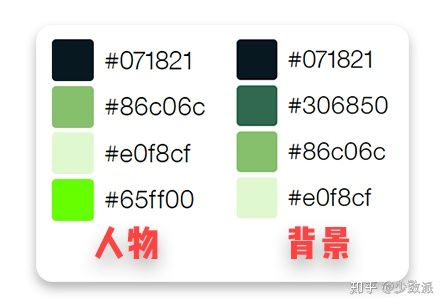 GameBoy 的屏幕仅支持显示四种灰度,因此在绘制素材时,我们也要谨记这一点。官方文档为背景素材提供了四种可以使用的颜色:#072821(黑色)、#306850(深绿)、#86c06c(浅绿)、#e0f8cf(白色),人物素材在这四色的基础上,删掉了 #306850(深绿),加上了 #65ff00 用于表示透明色。